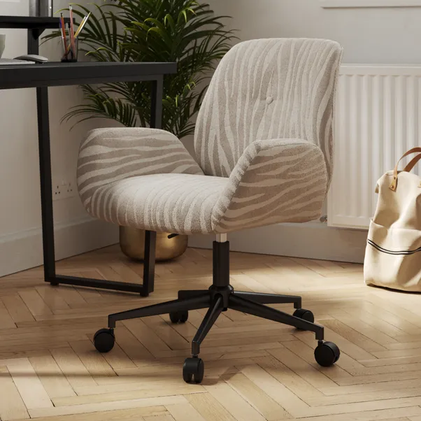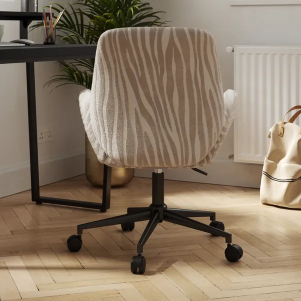 Bring bold style and comfort to your workspace with the Ginny Zebra Print Swivel Office Chair. Featuring eye-catching zebra upholstery, 360° swivel, and adjustable height, it provides ergonomic support for long hours. Perfect for home offices or modern professional environments.
